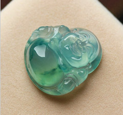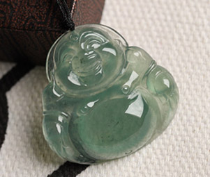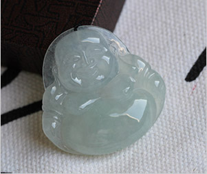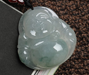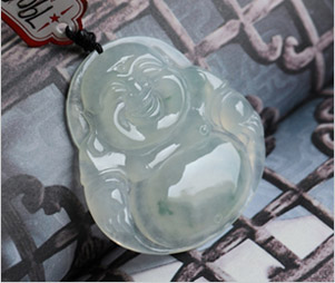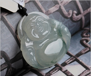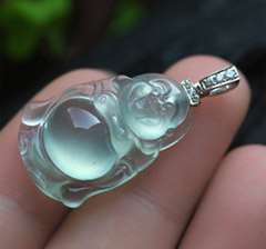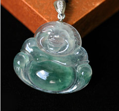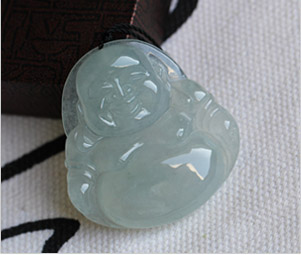 清澈明亮天然緬甸老坑A貨玻璃種熒光翡翠彌勒佛公掛件